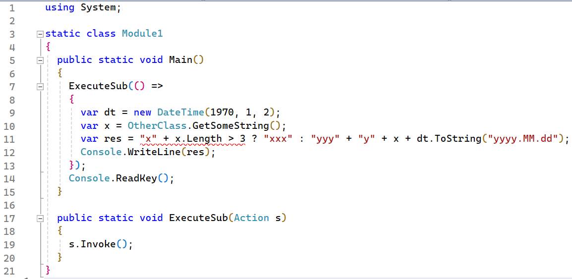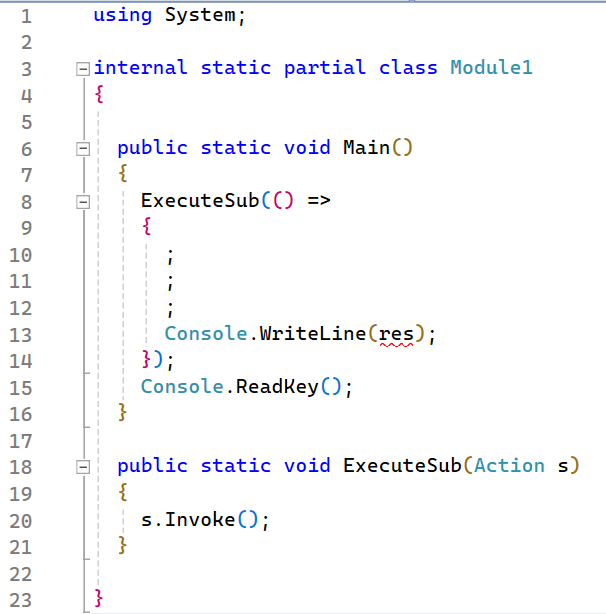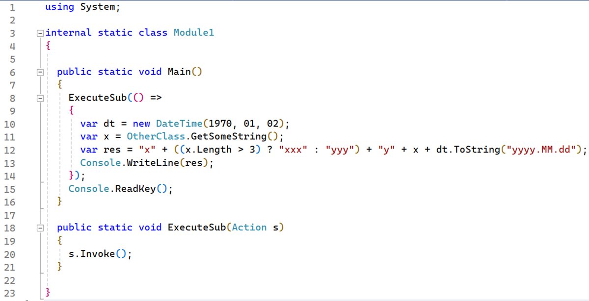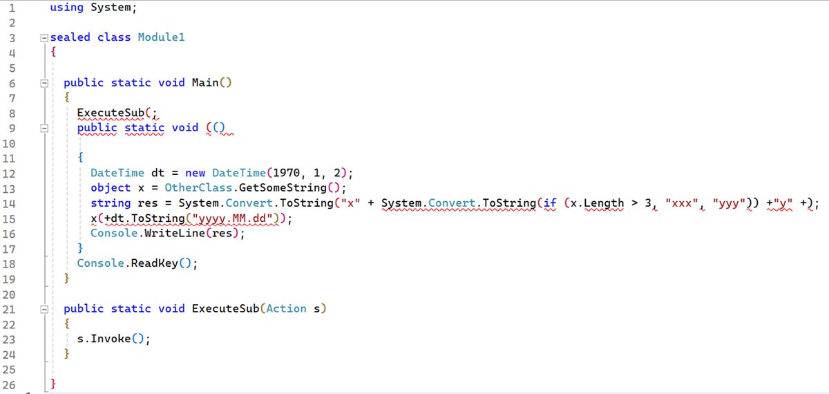 Also, any variable declaration with an initializer of an inferred type (Dim VariableName =...) is converted to object VariableName =... (output line 13). The other converters output var VariableName= ... which works a lot better.
